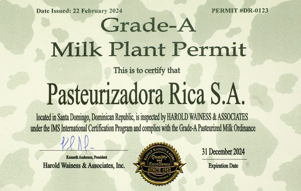 Este documento certifica que la Planta Rica cumple con la exigente norma “Pasteurized Milk Ordinance” (PMO), requerida para la elaboración y venta de productos lácteos en los E.E.U.U., convirtiéndose en miembro del selecto grupo de solo 10 empresas, fuera de los Estados Unidos, certificadas bajo este programa y la primera y única en el Caribe y Centroamérica.